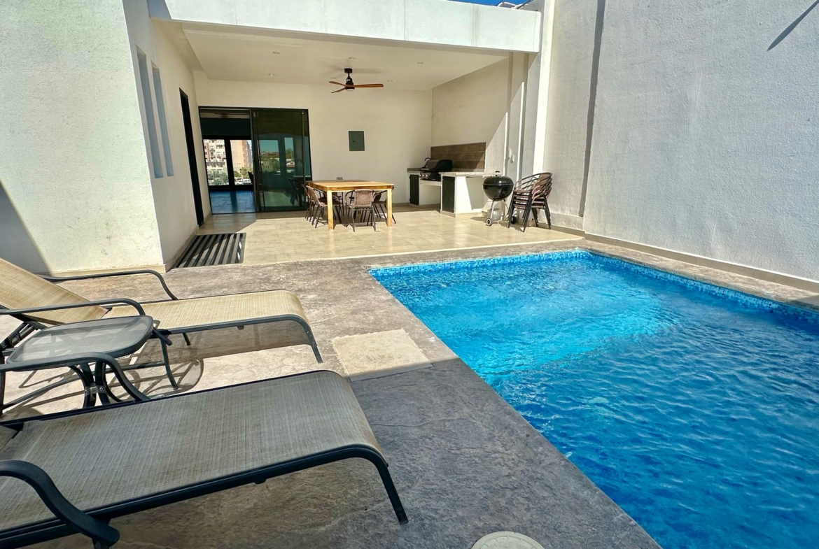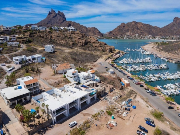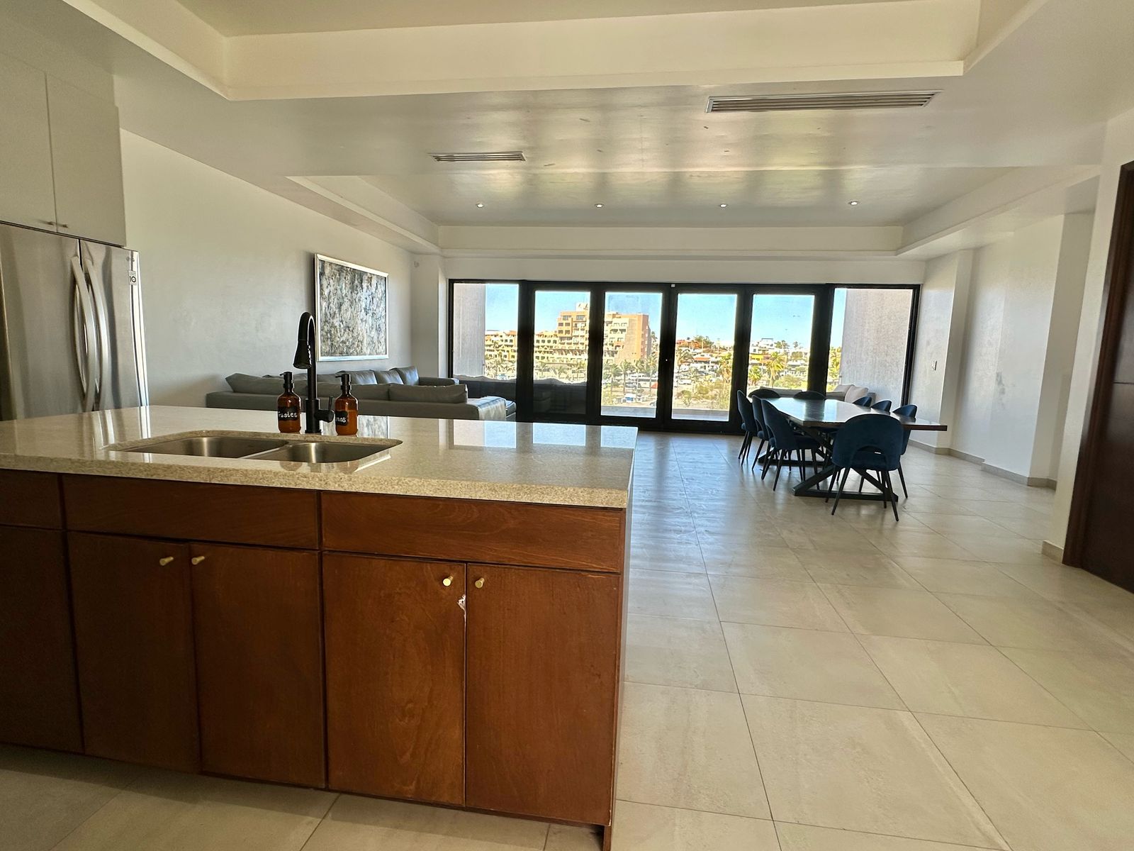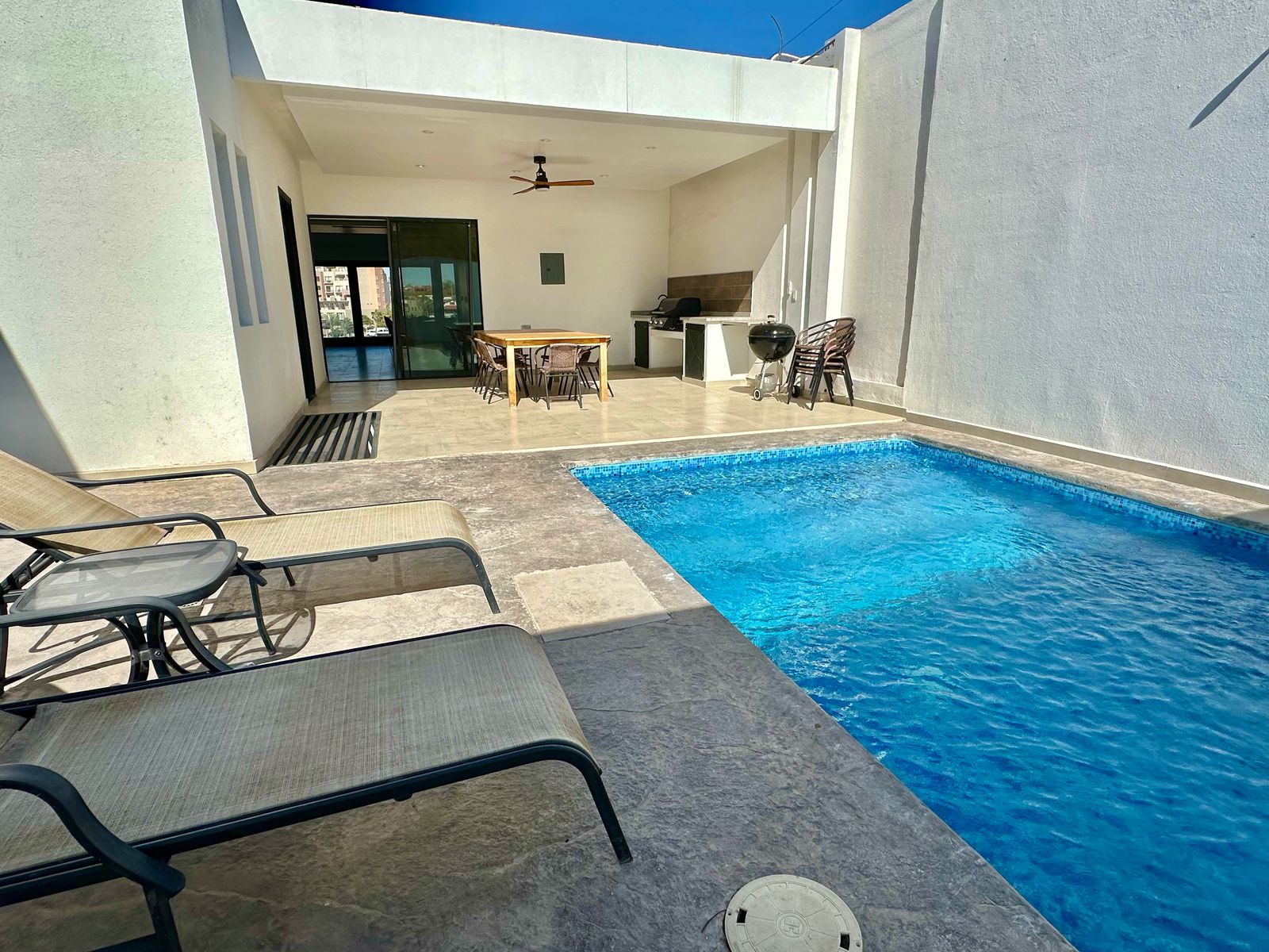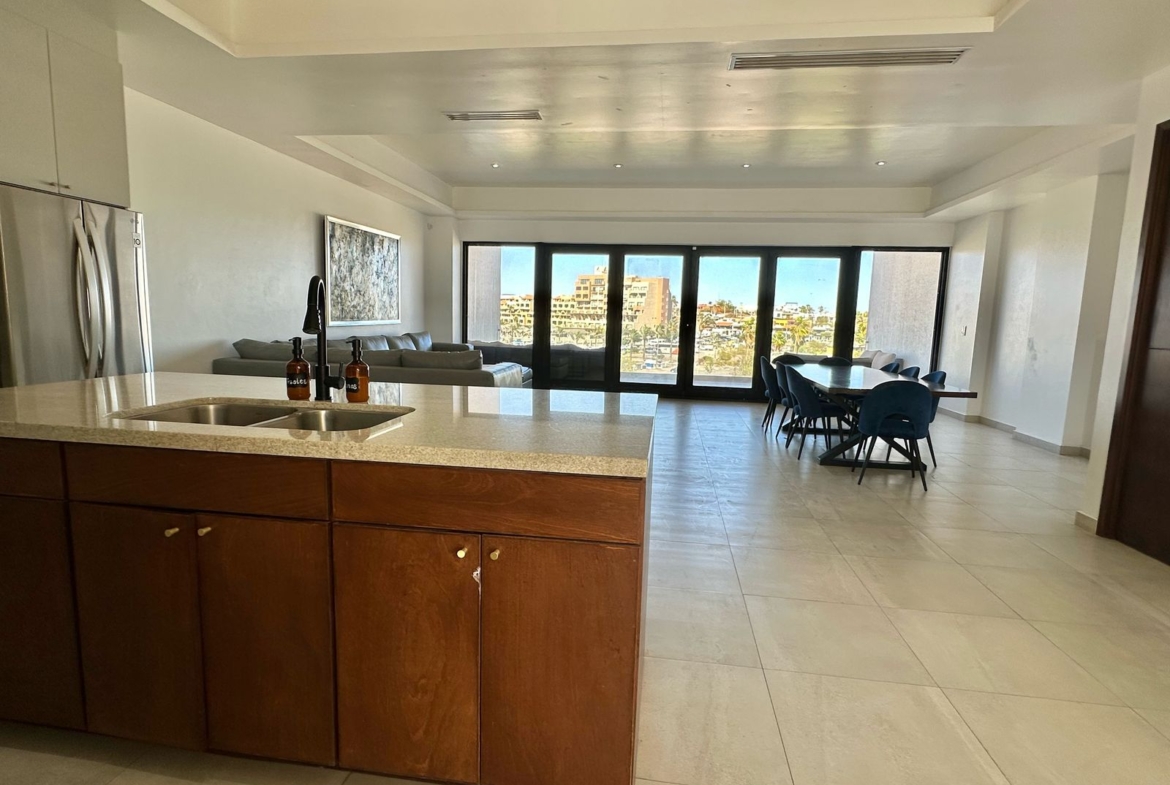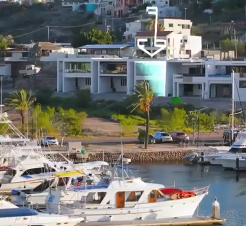 Sala, comedor, medio baño, cocina con vista y terraza con vista a la marina. Patio con alberca, recamara con baño.