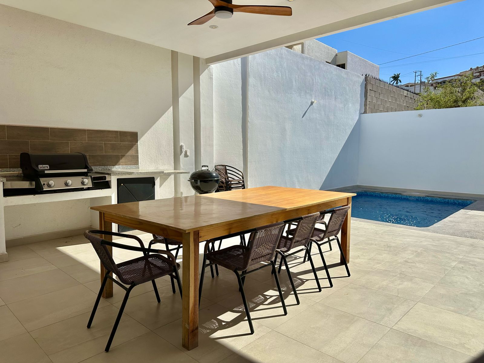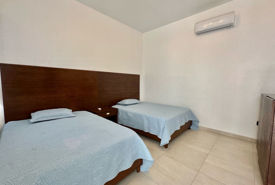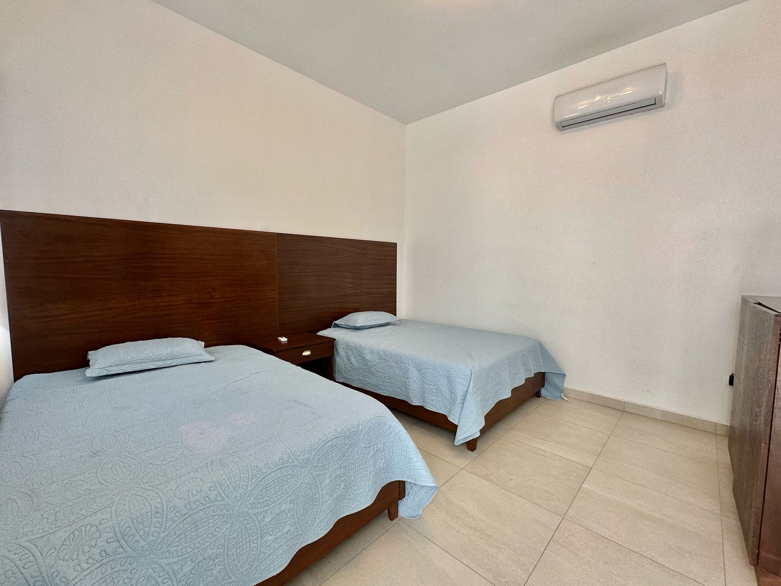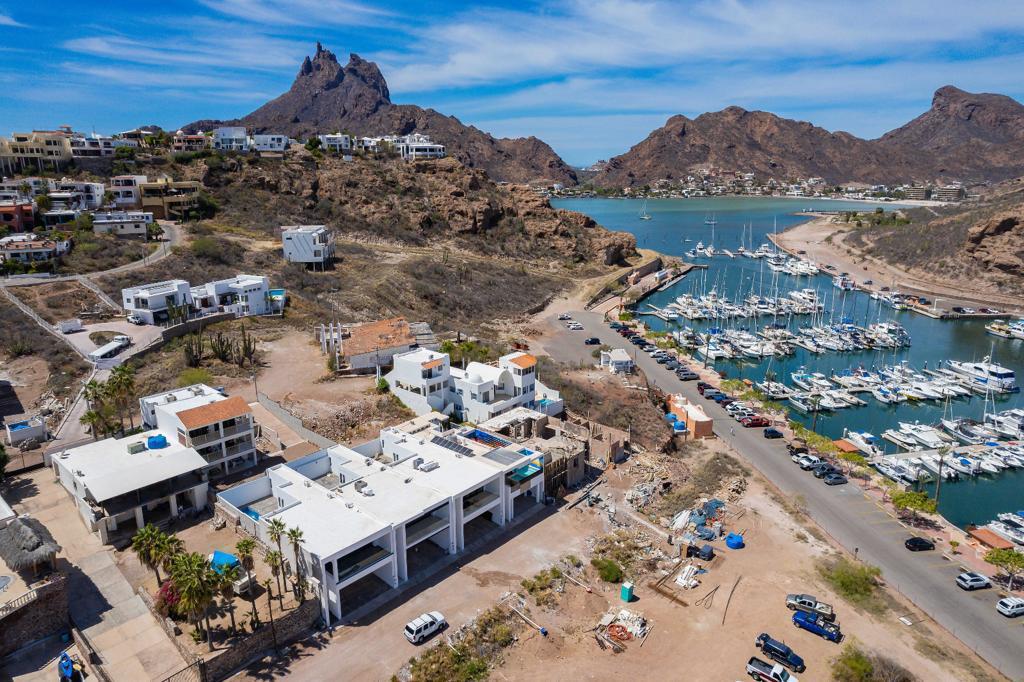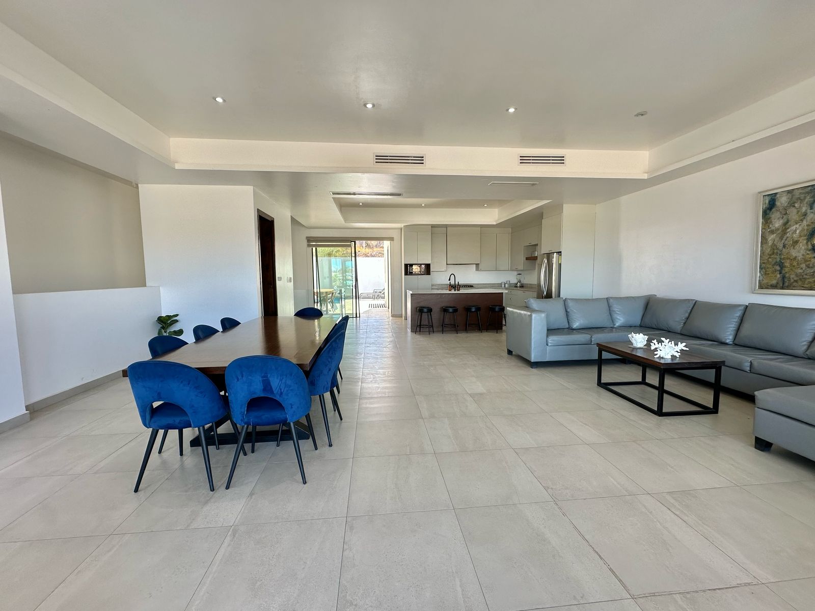 Sala, comedor, medio baño, cocina con vista y terraza con vista a la marina. Patio con alberca, recamara con baño.