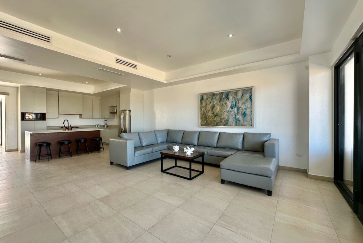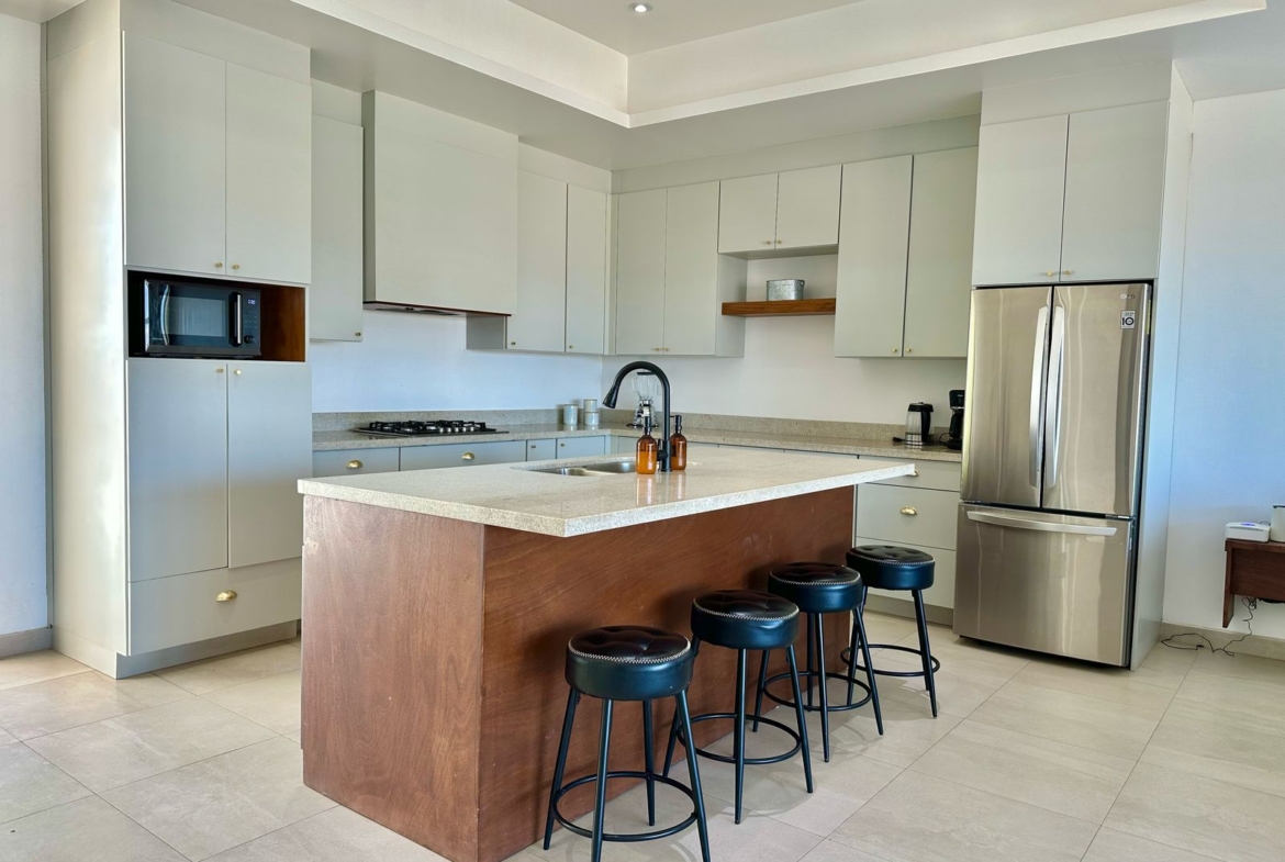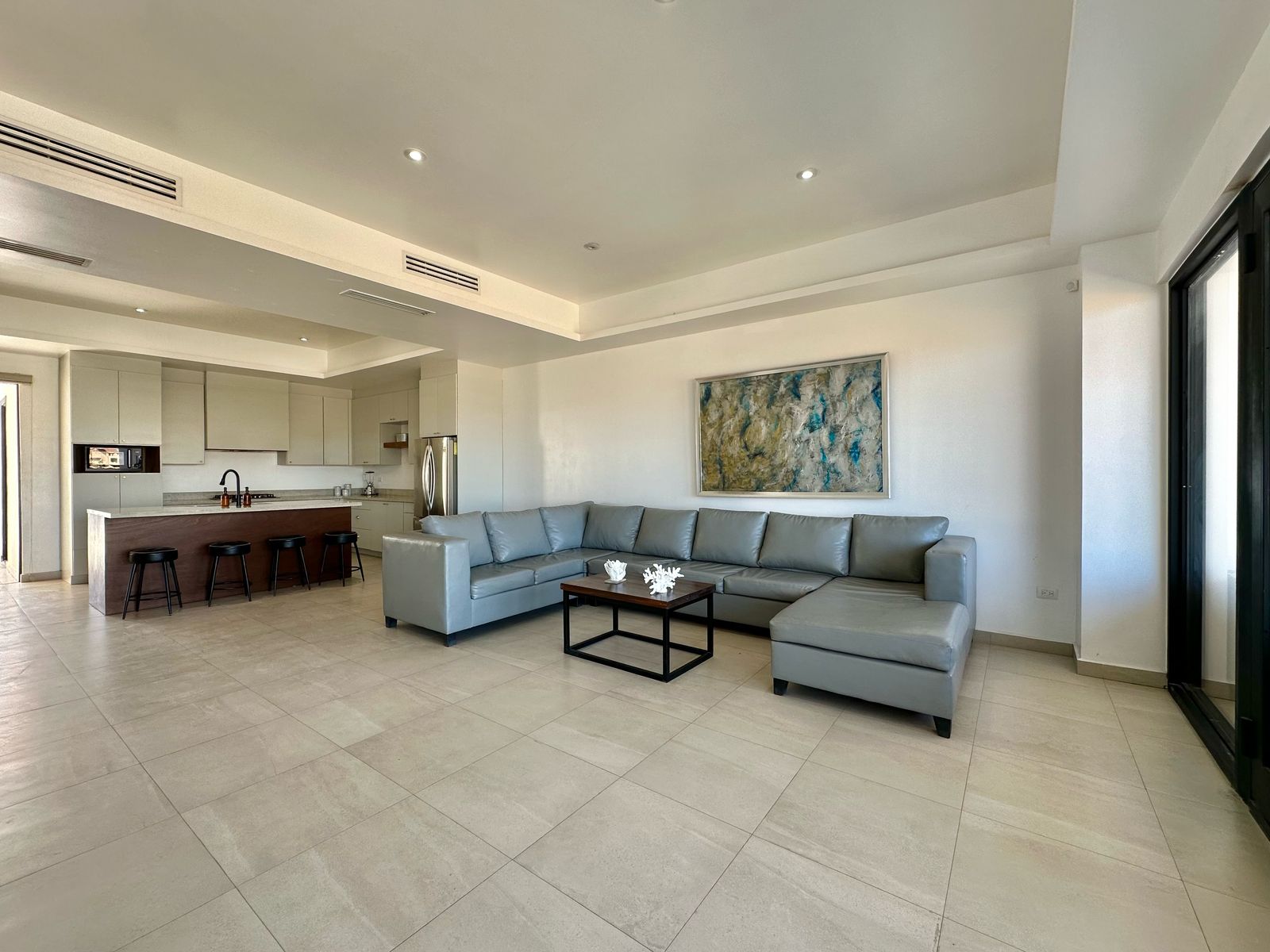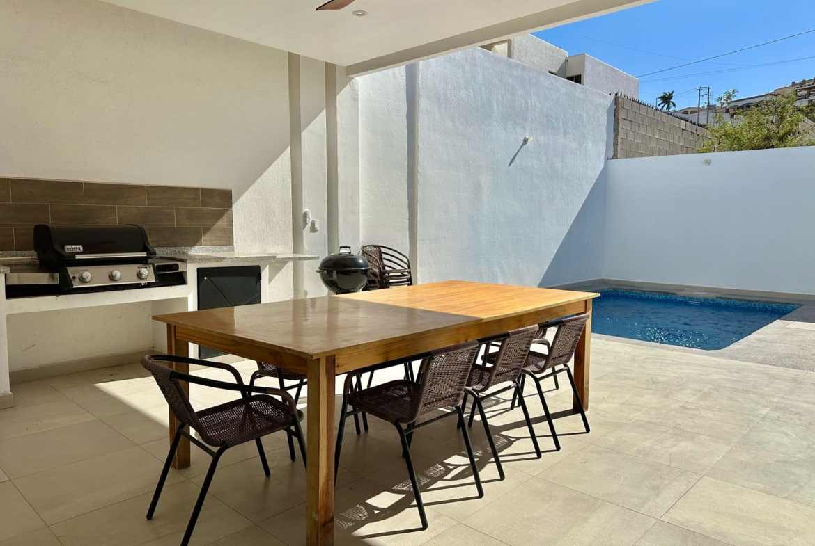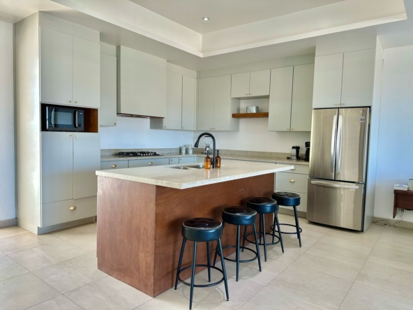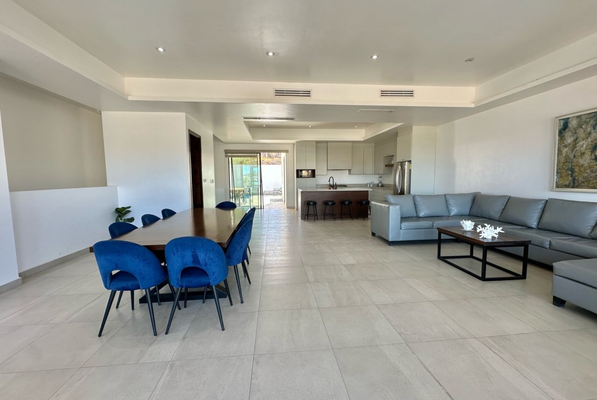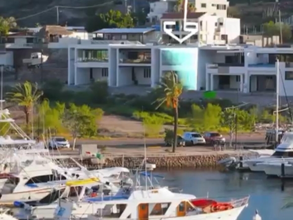 Sala, comedor, medio baño, cocina con vista y terraza con vista a la marina. Patio con alberca, recamara con baño.