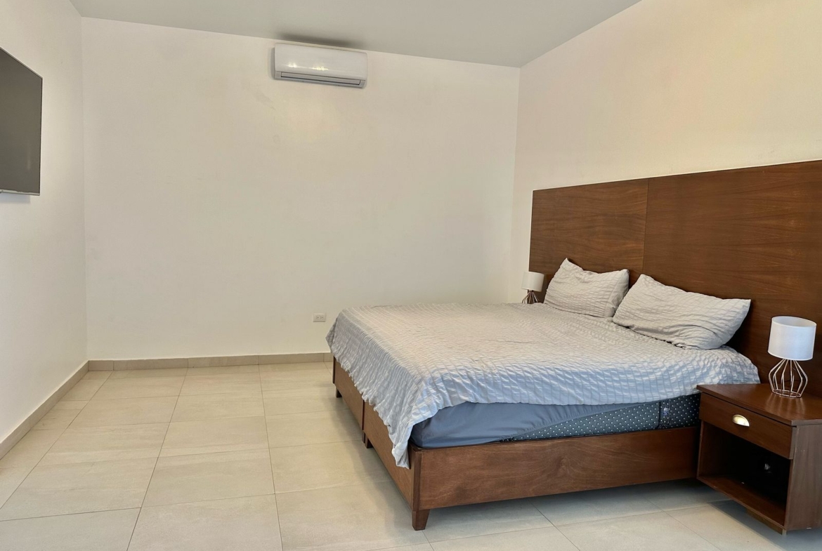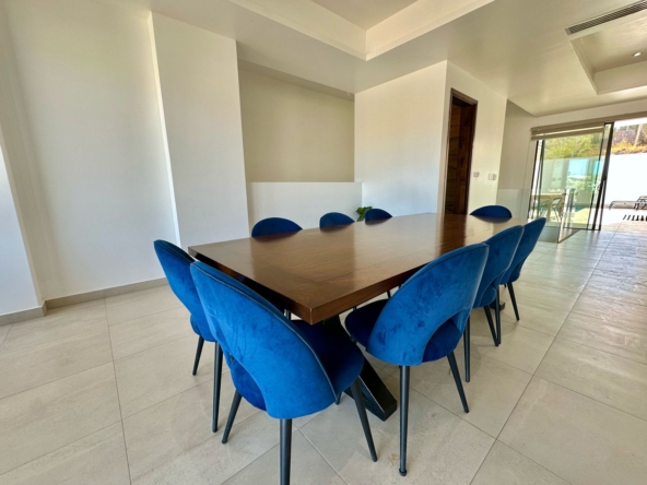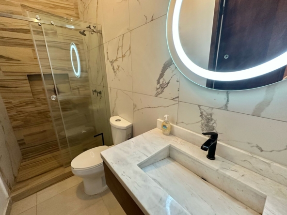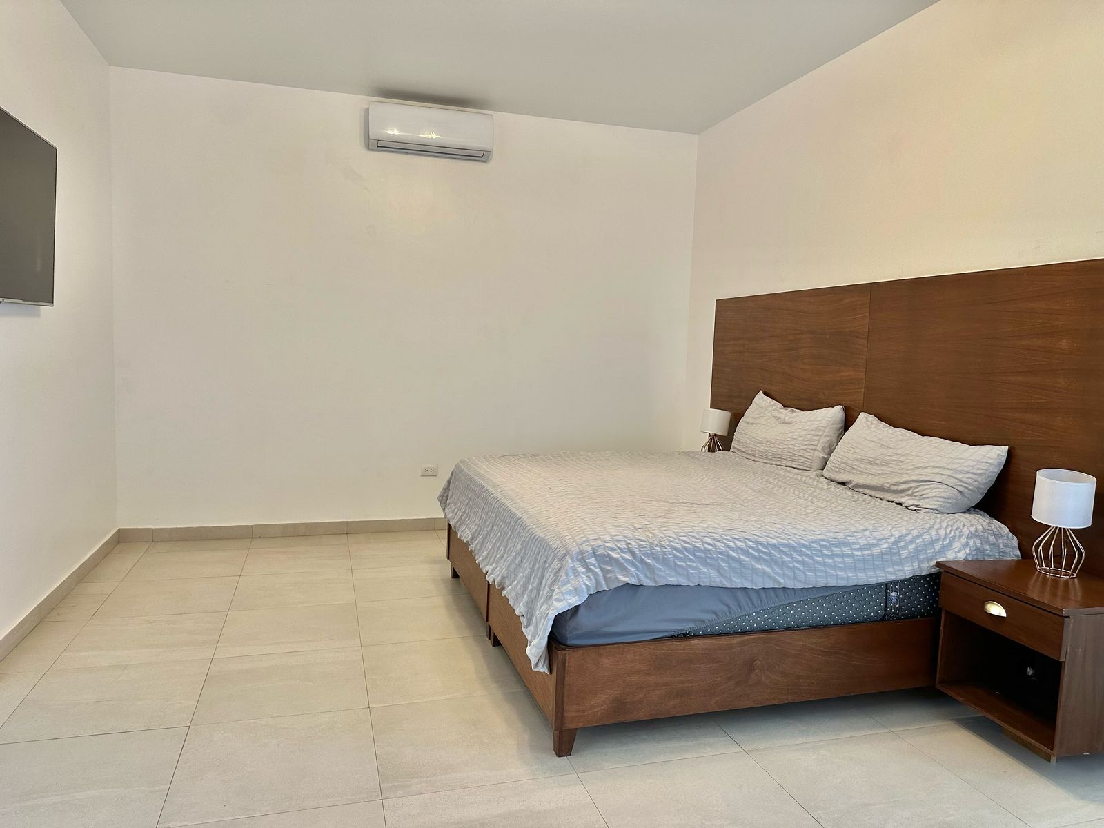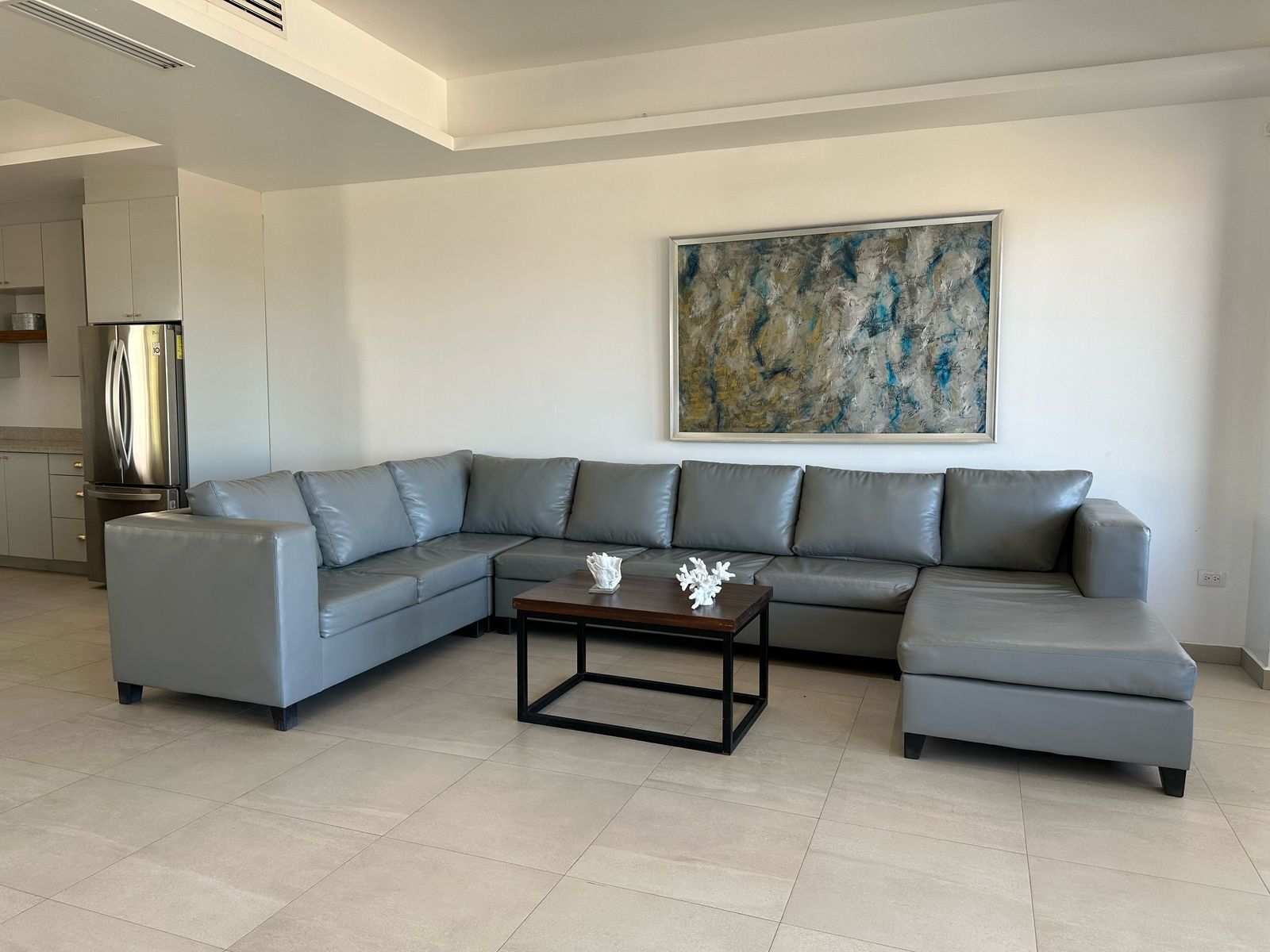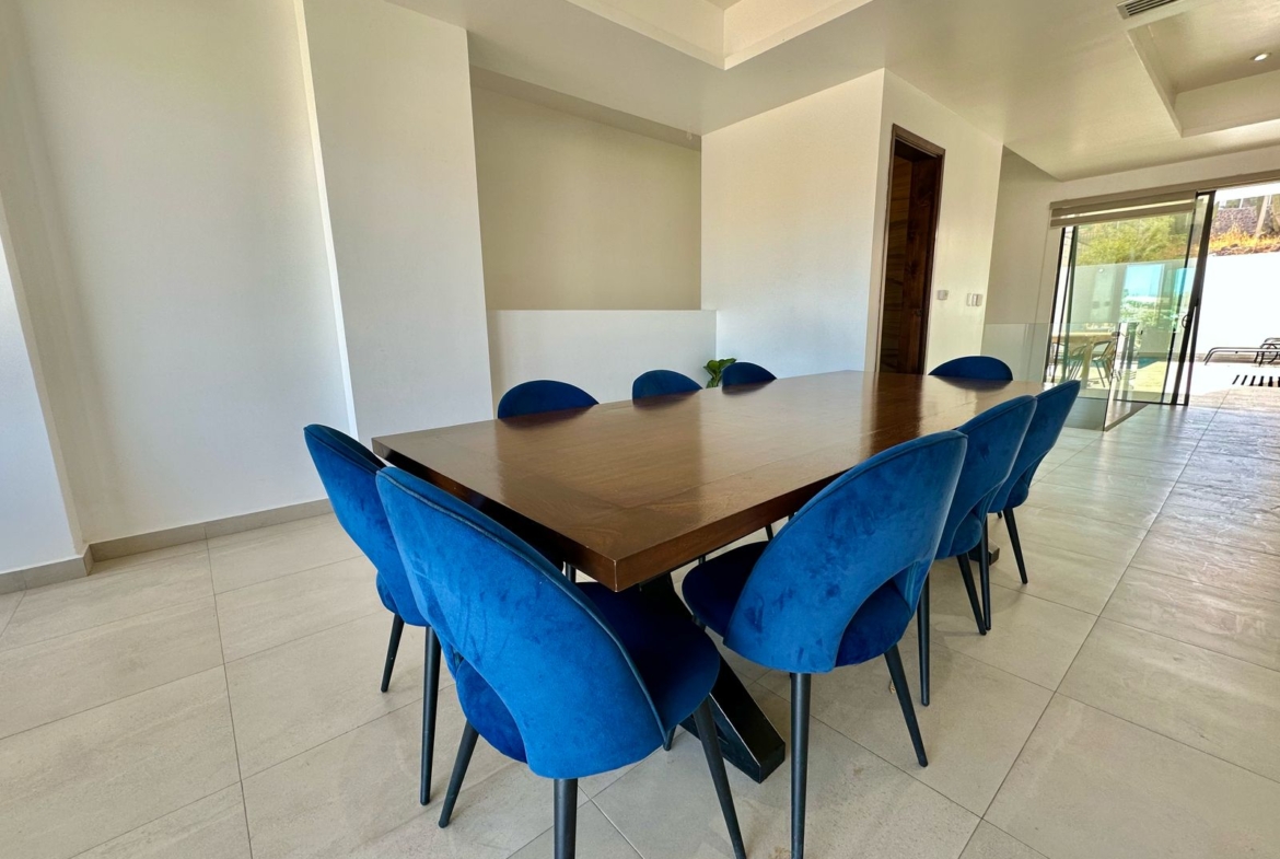 Sala, comedor, medio baño, cocina con vista y terraza con vista a la marina. Patio con alberca, recamara con baño.