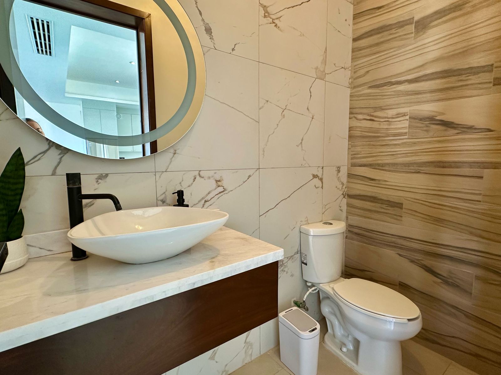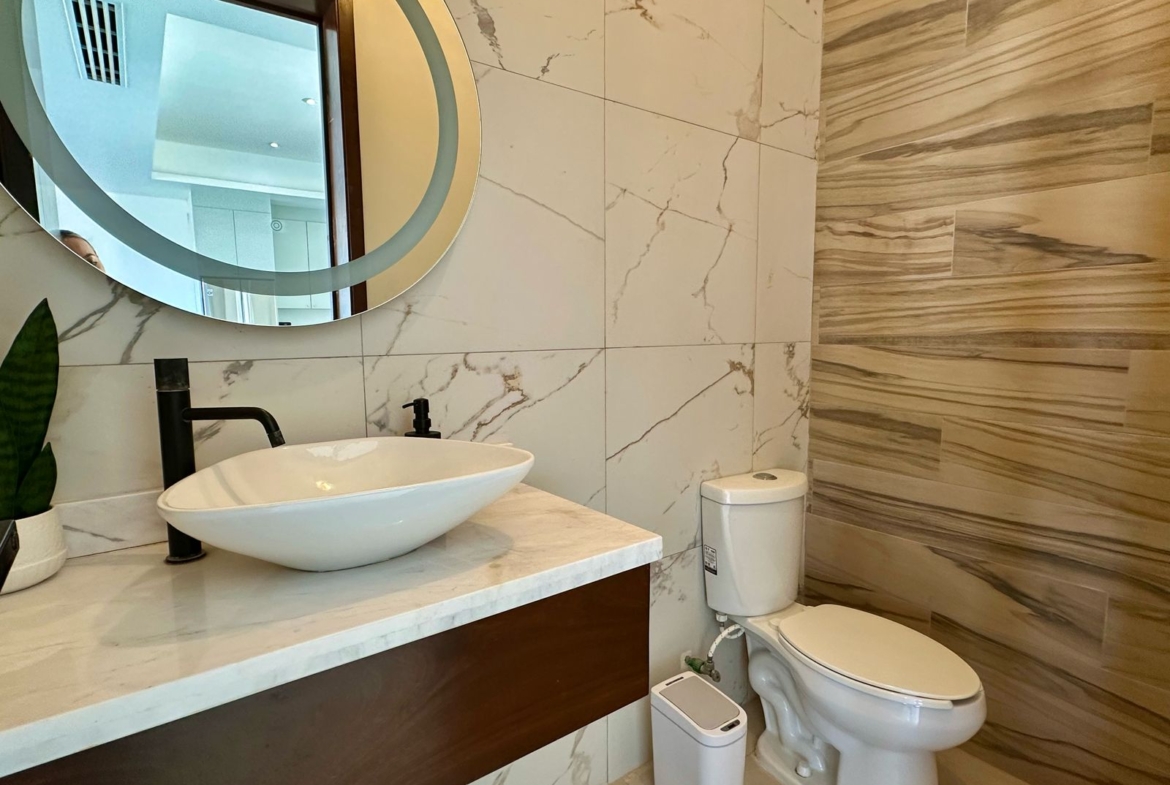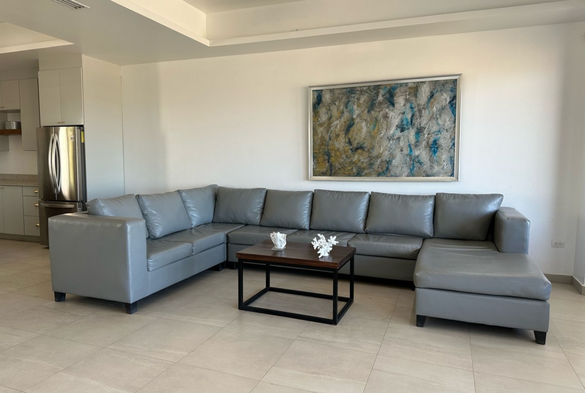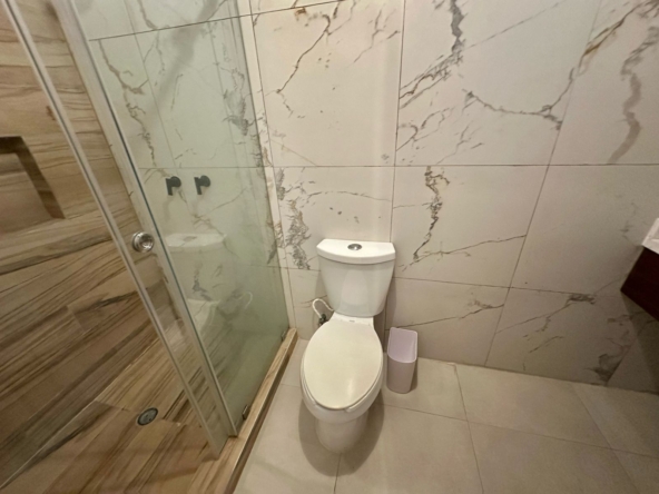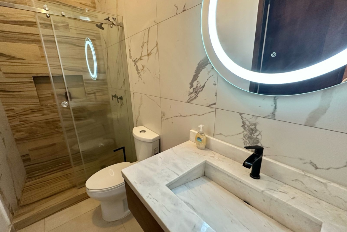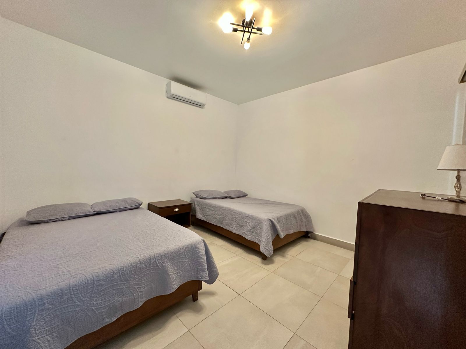 Sala, comedor, medio baño, cocina con vista y terraza con vista a la marina. Patio con alberca, recamara con baño.