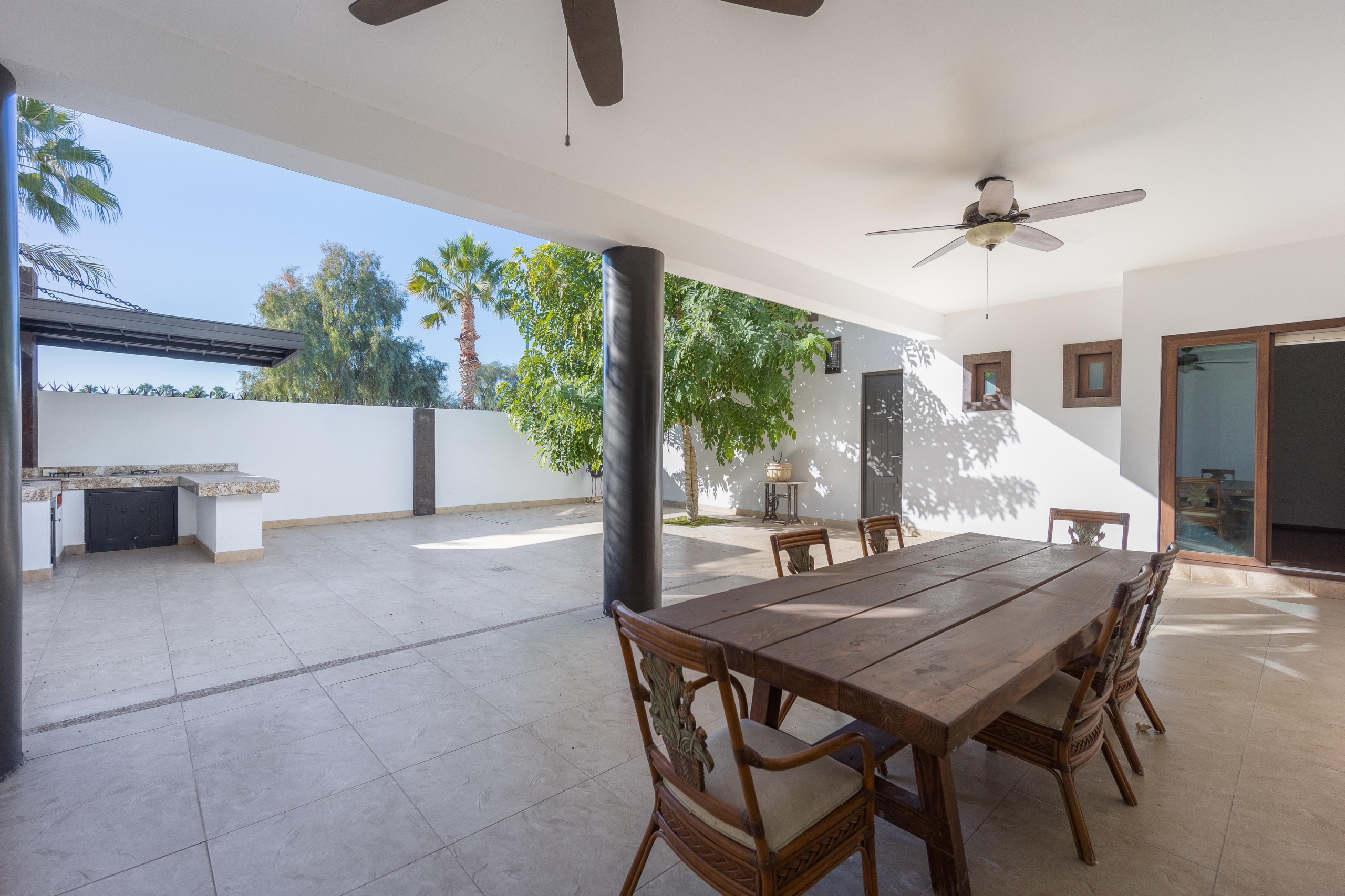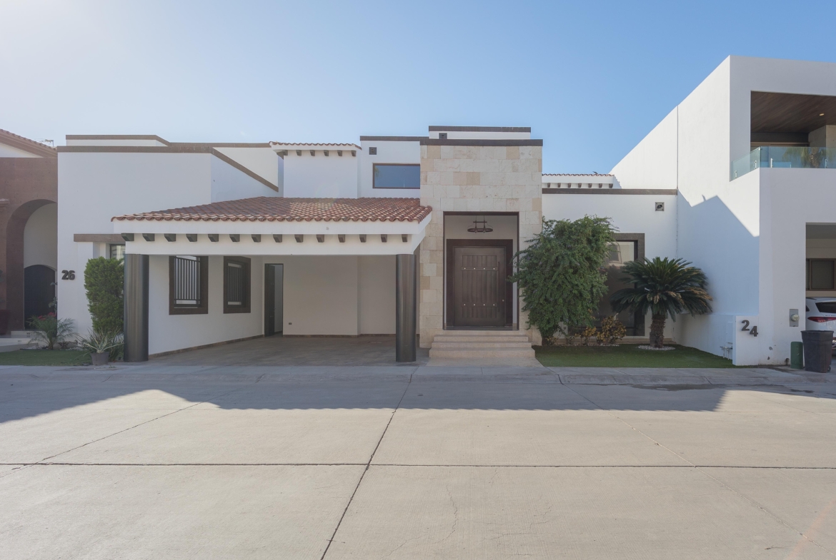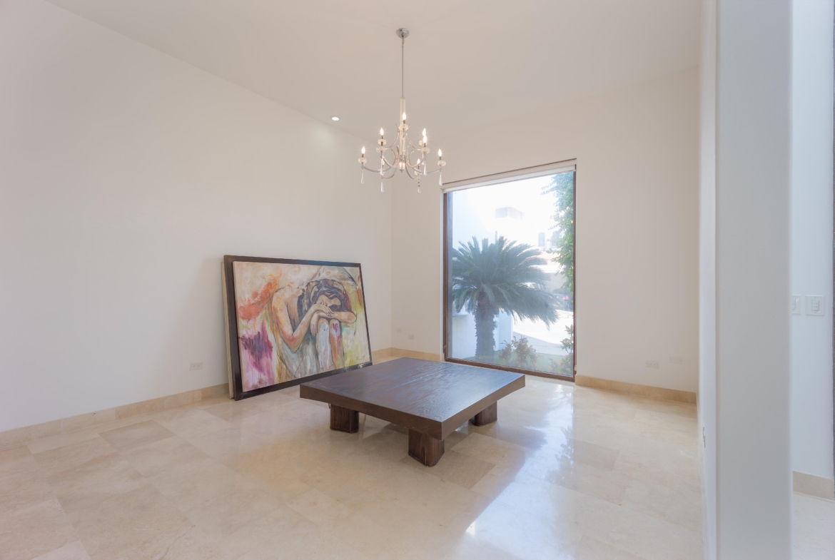 Cochera techada para 2 autos, recibidor doble altura, medio baño, sala-comedor, cocina con alacena, cuarto de lavado, cuarto chico con baño completo, estancia y desayunador. Recámara principal con baño y vestidor. Amplio patio con asador, bodega y medio baño. Cuarto de servicio con baño completo.