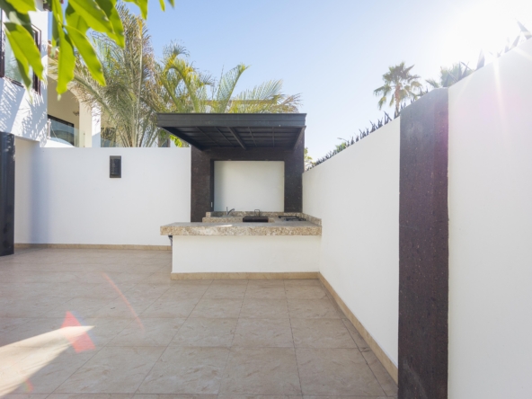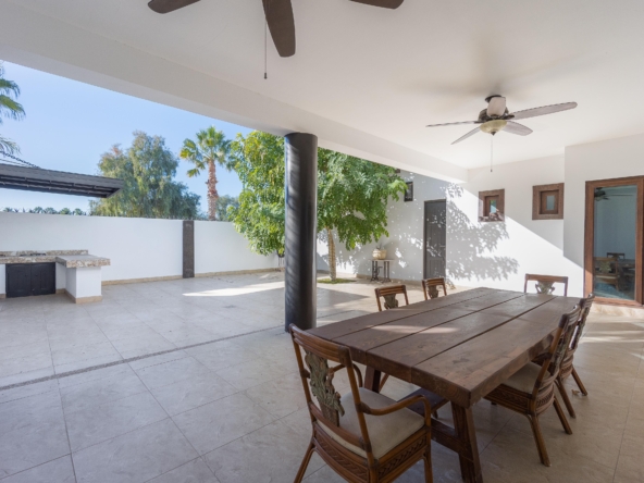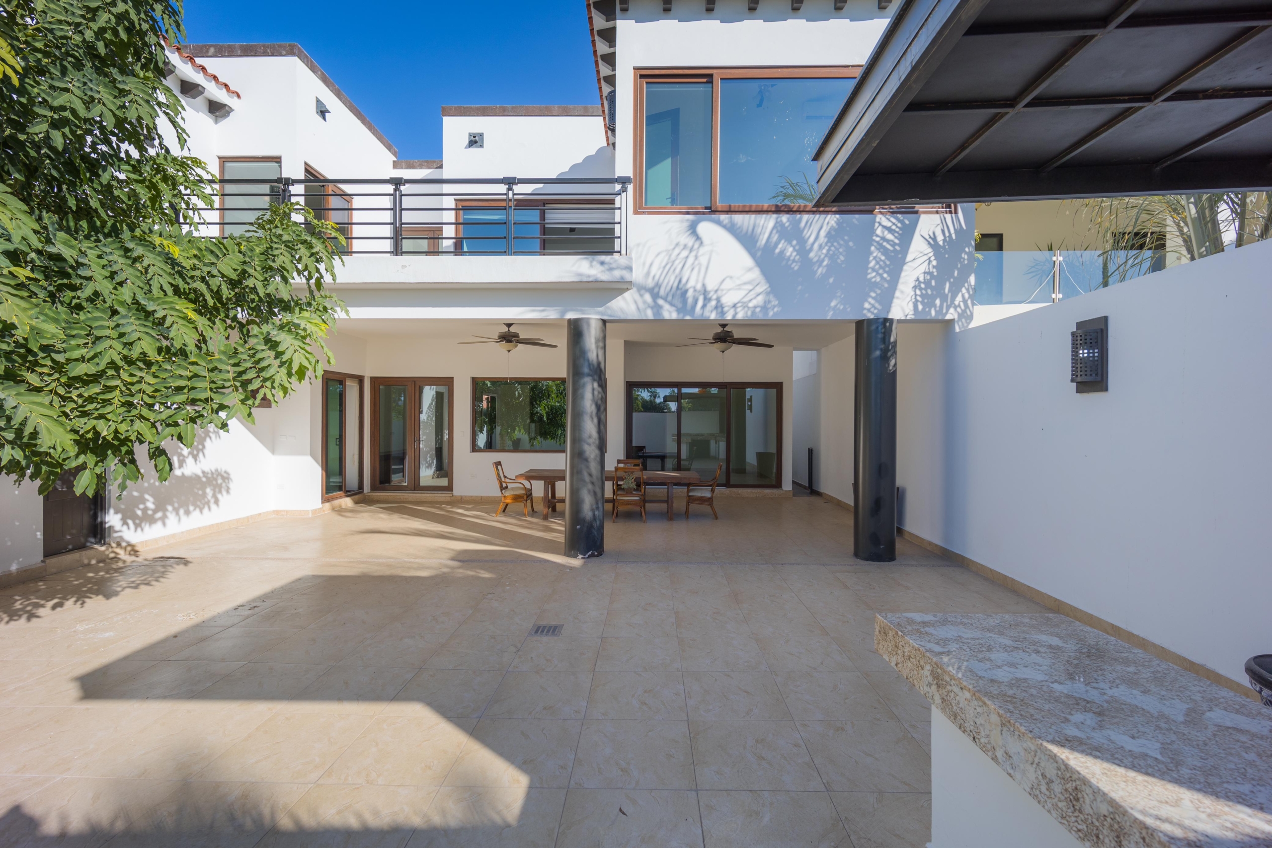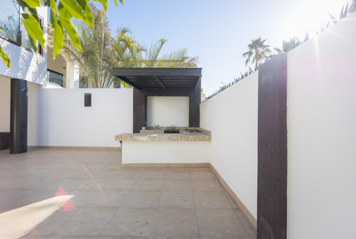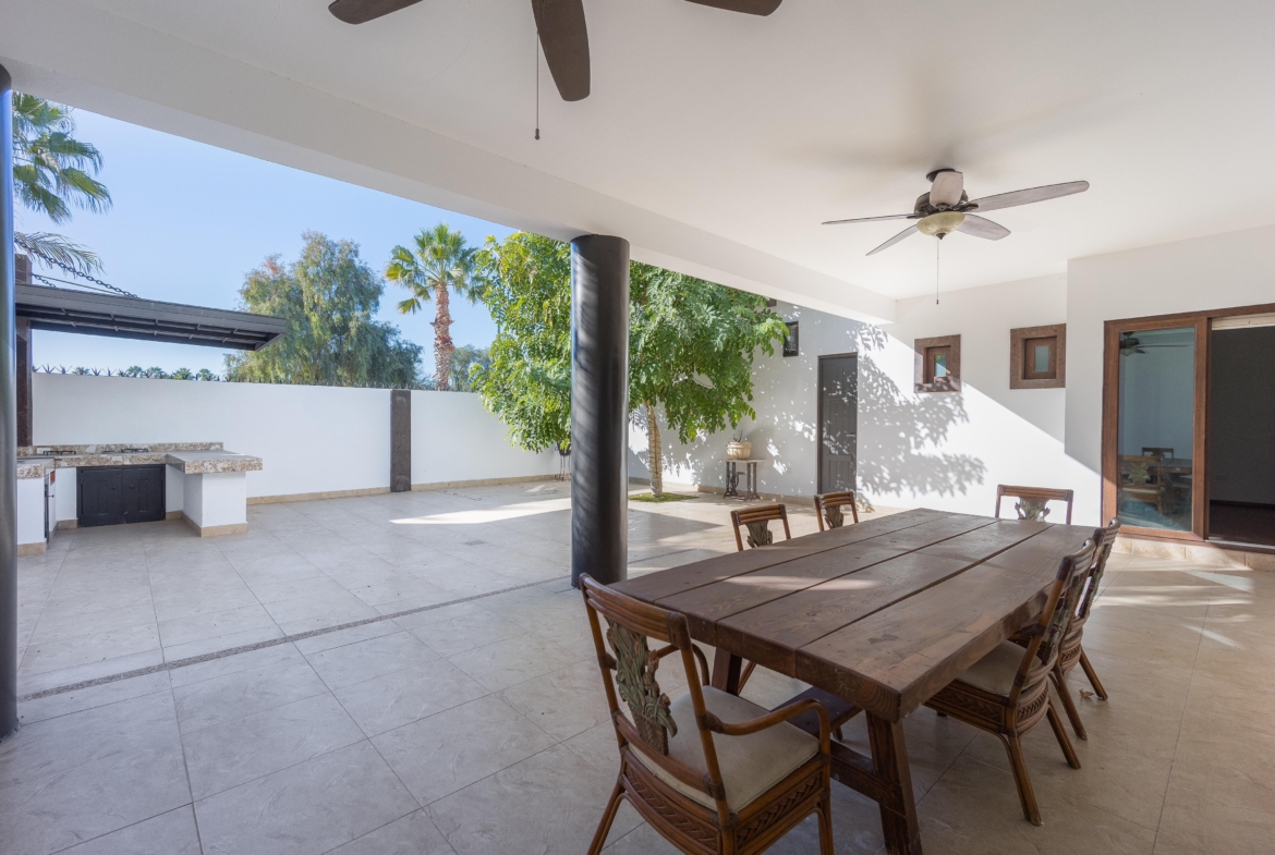 Cochera techada para 2 autos, recibidor doble altura, medio baño, sala-comedor, cocina con alacena, cuarto de lavado, cuarto chico con baño completo, estancia y desayunador. Recámara principal con baño y vestidor. Amplio patio con asador, bodega y medio baño. Cuarto de servicio con baño completo.