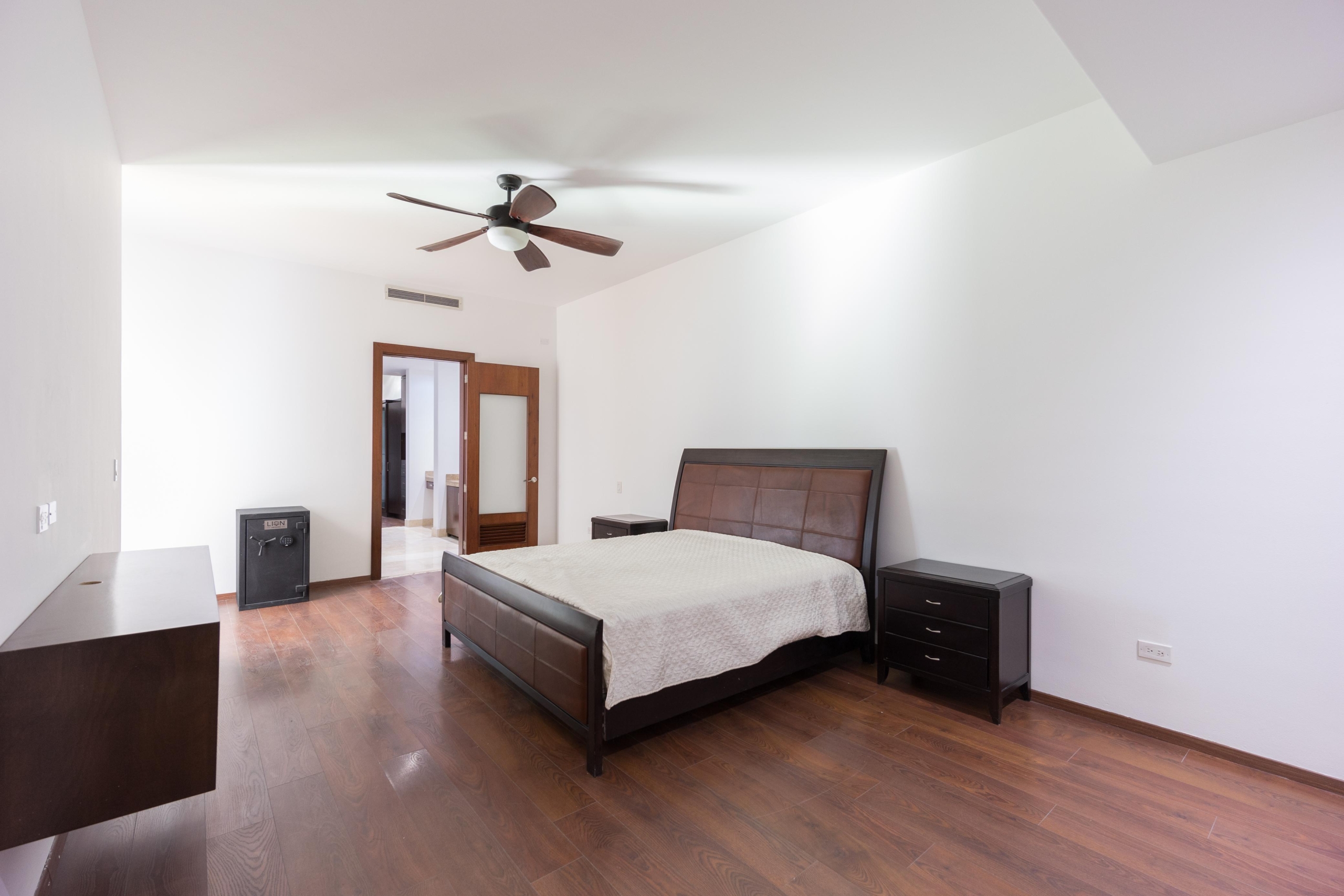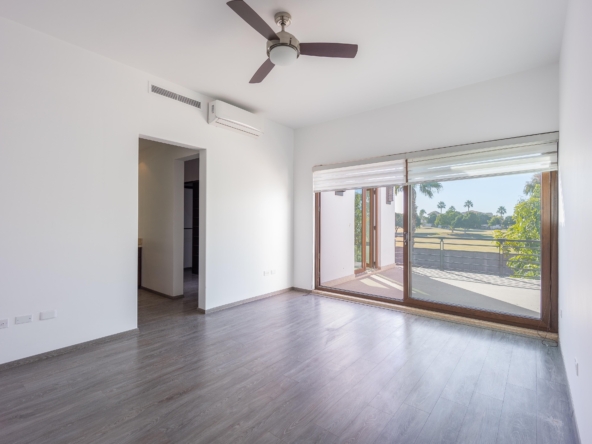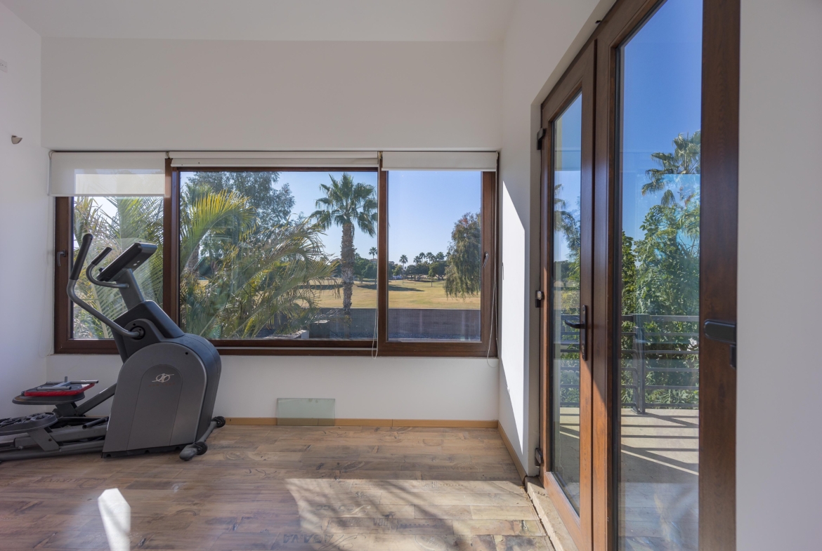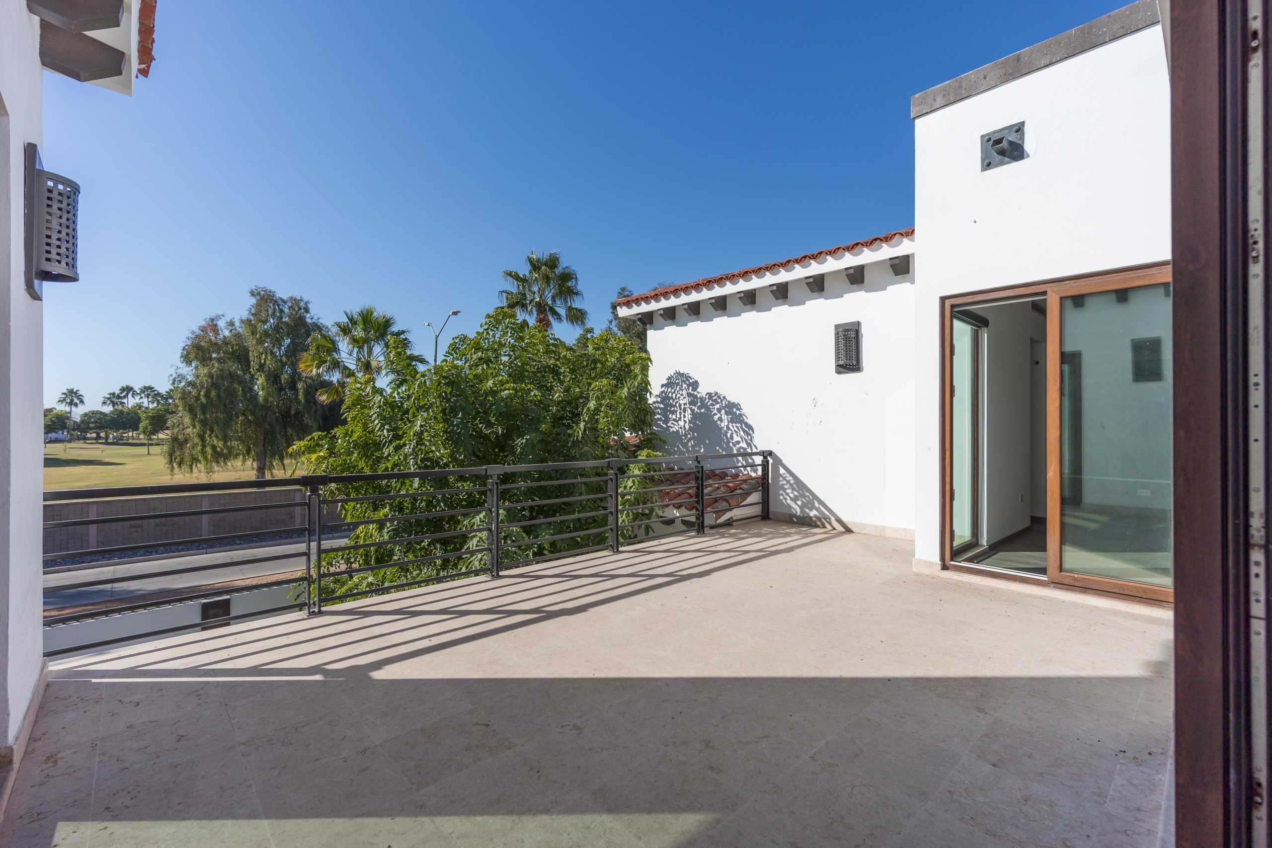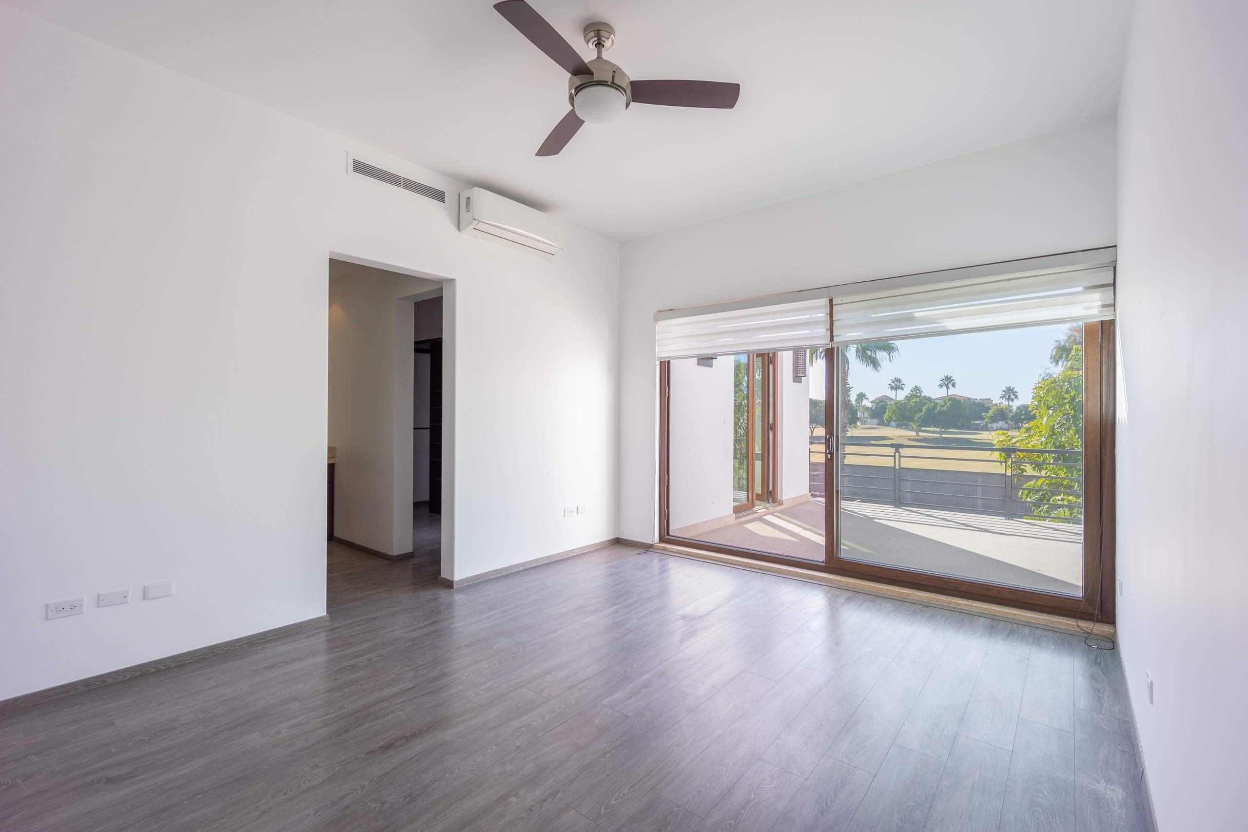 Estancia, cuarto tipo bodega, 3 recámaras c/u con baño y vestidor. Gimnasio y terraza con vista al campo de golf de Los Lagos.