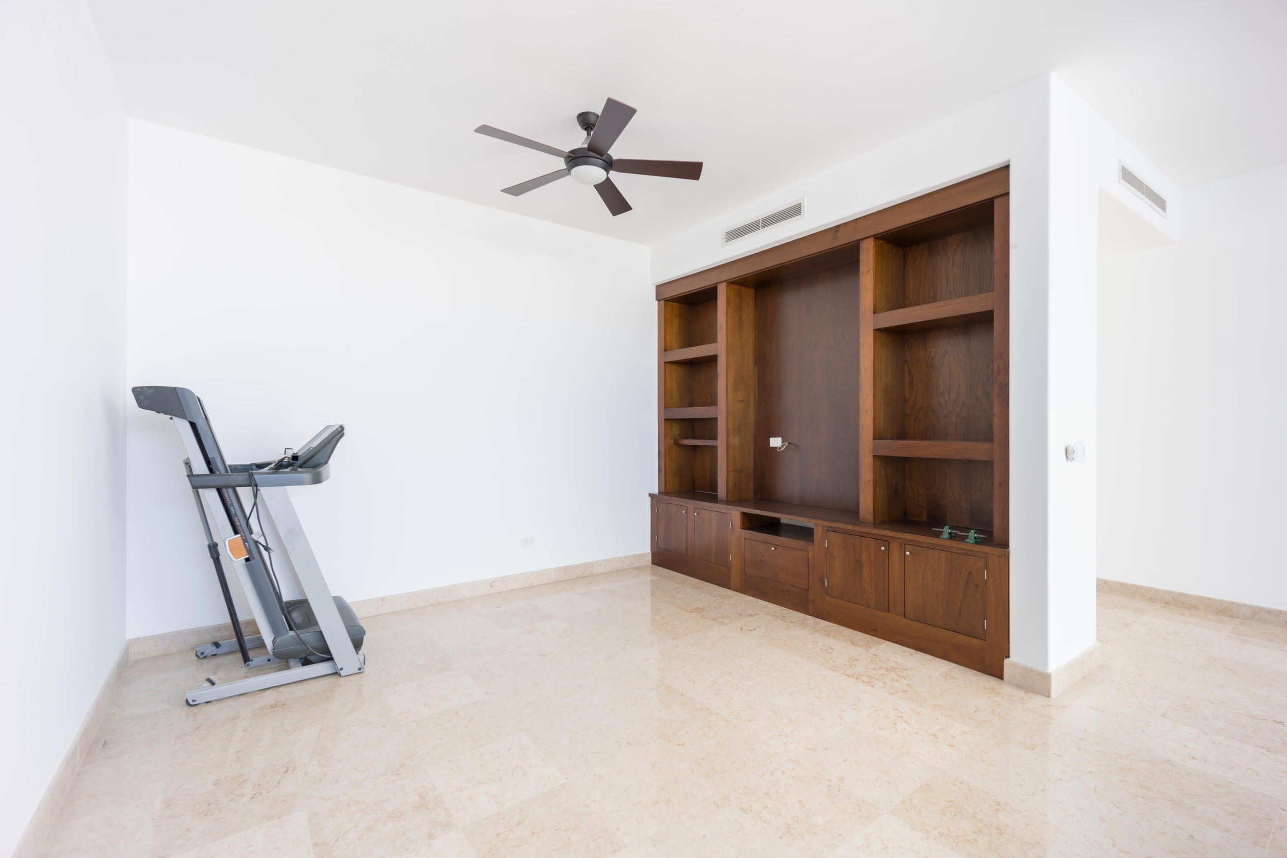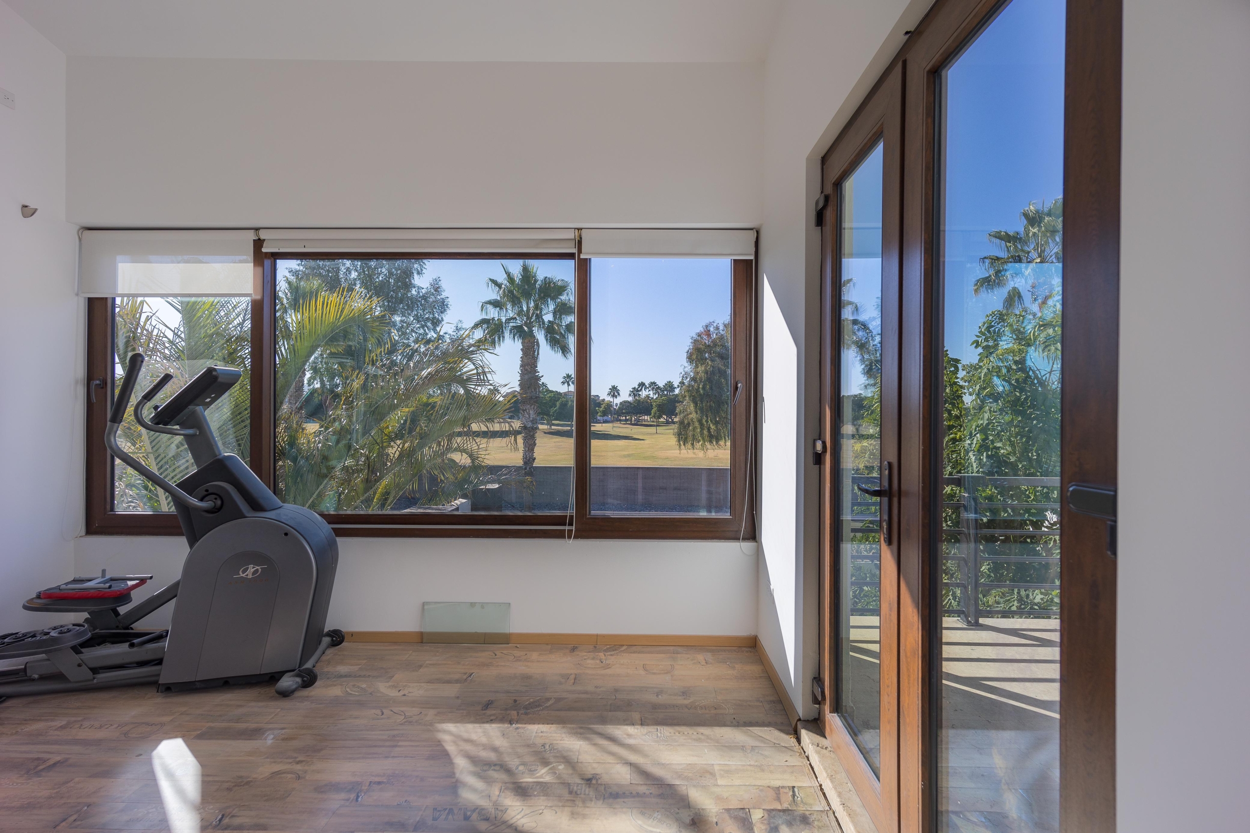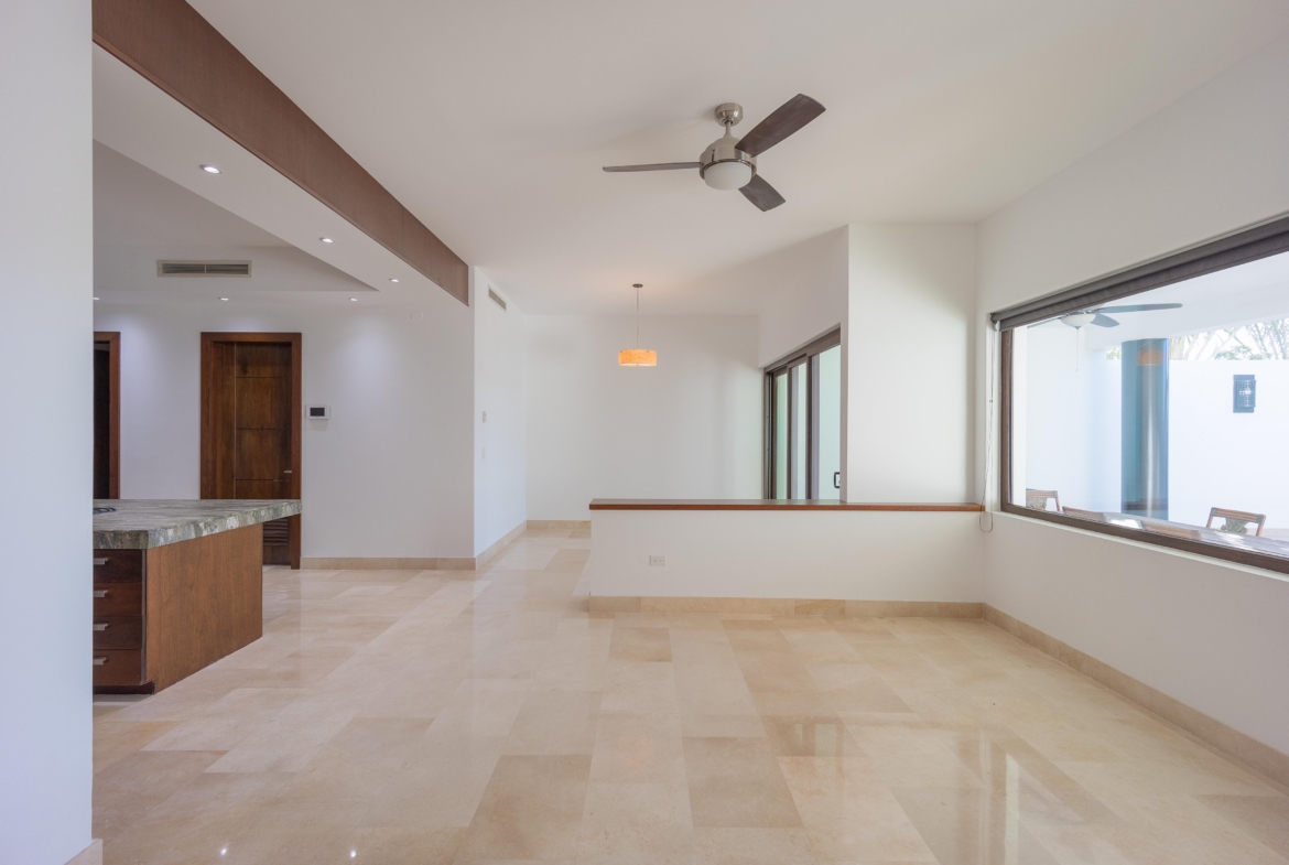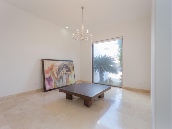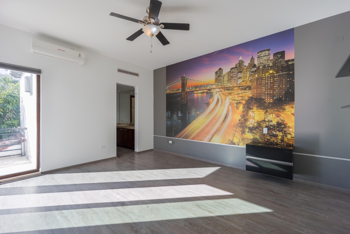 Estancia, cuarto tipo bodega, 3 recámaras c/u con baño y vestidor. Gimnasio y terraza con vista al campo de golf de Los Lagos.