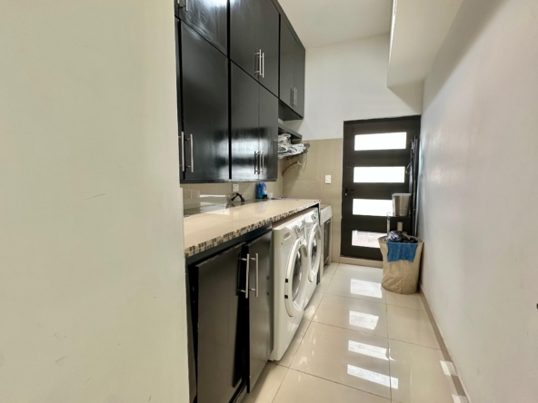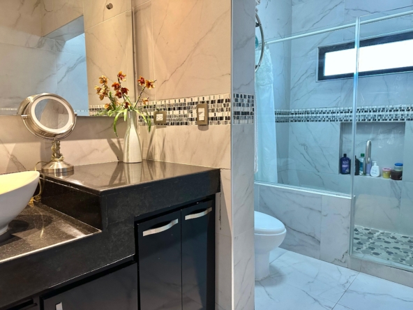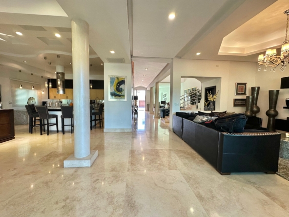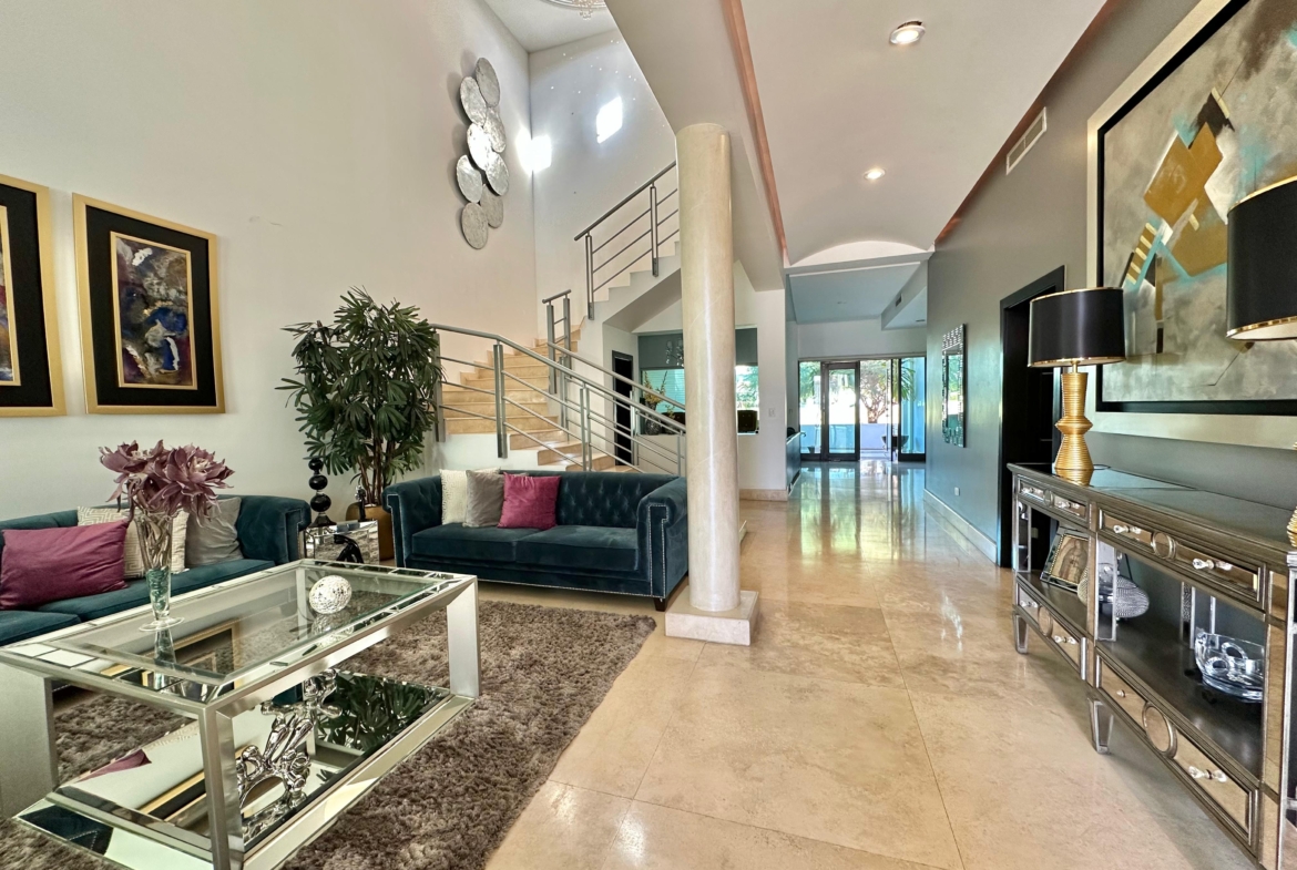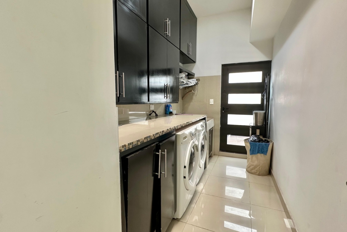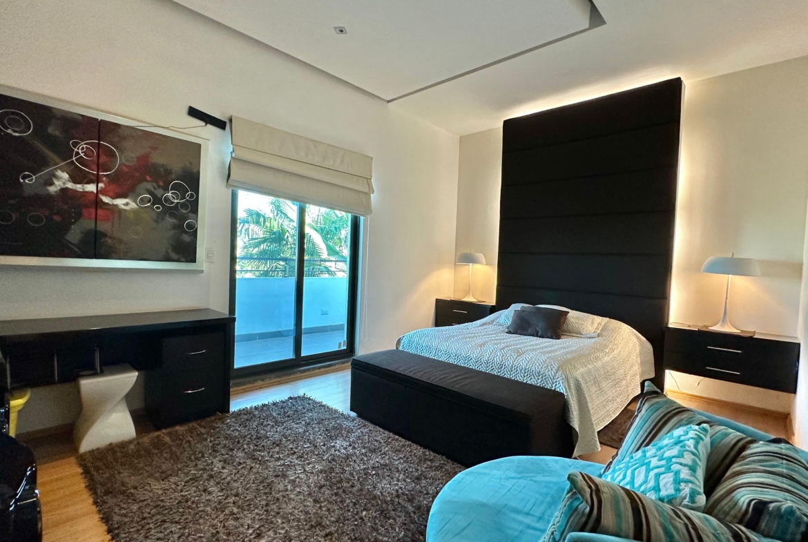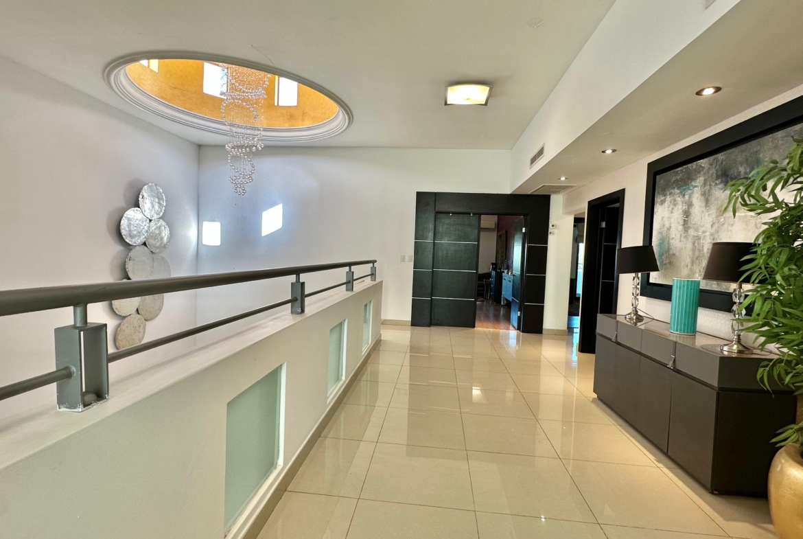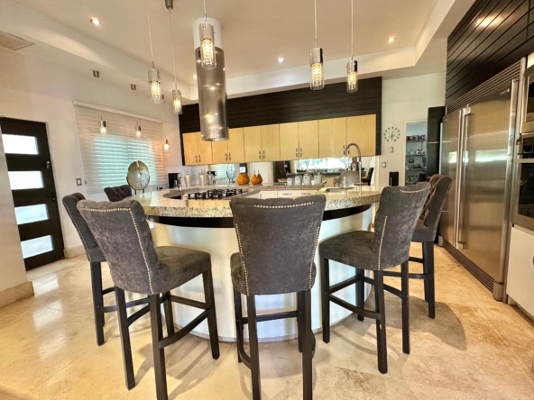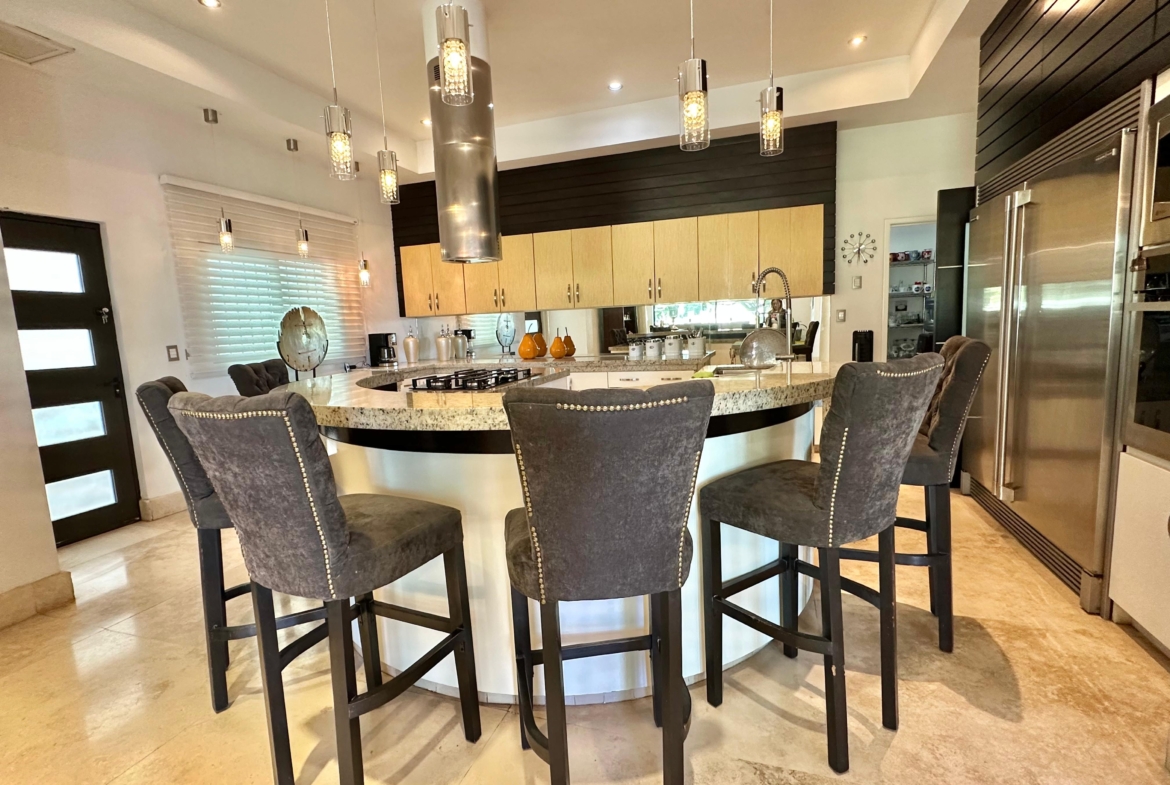 Cocina integral con estufa, campana, triturador, refrigerador, isla, granito, paneles solares, pisos laminados de madera rosa morada en todas las áreas, cristal templado en escaleras y balcón, 3 aires centrales (1 de 5t, 1 de 4t y 1 de 3t en rec ppal), espejos en baños, lámparas en cocina y sala, cortinas en todas las áreas, boiler, cisterna con hidroneumático h tanque estacionario de gas.