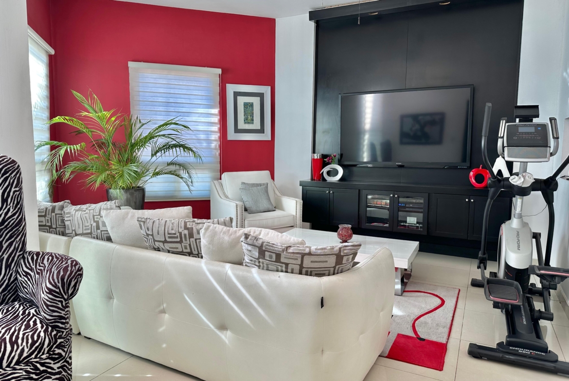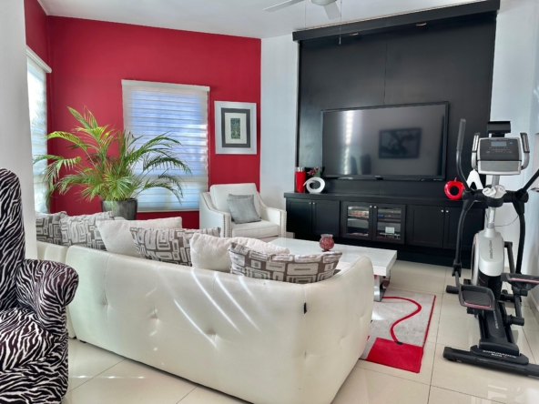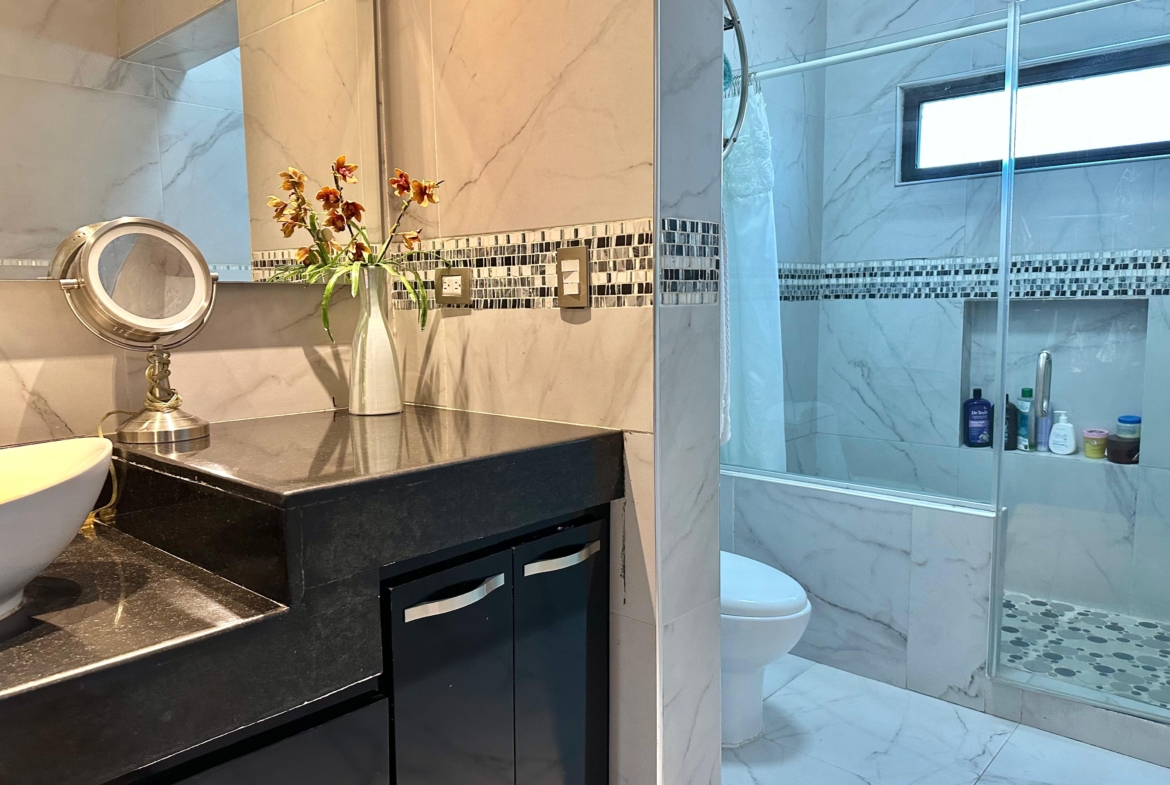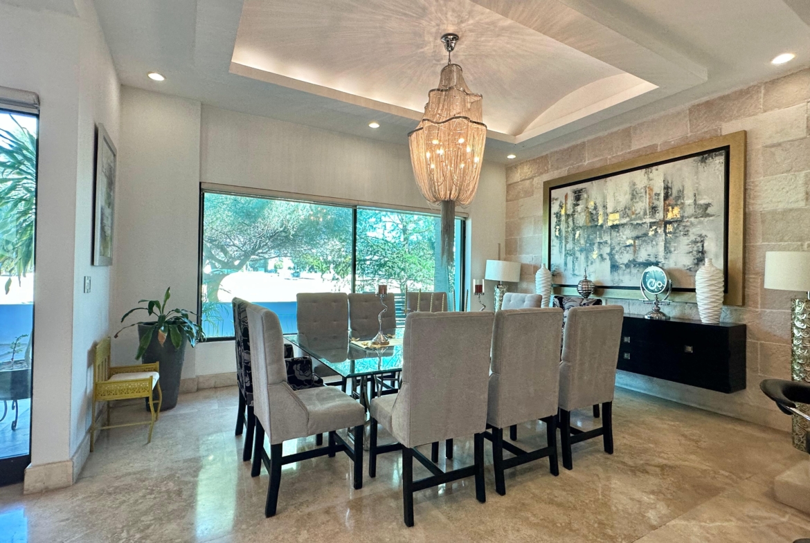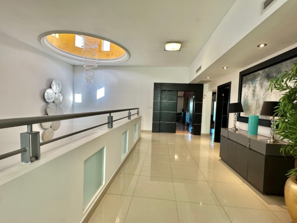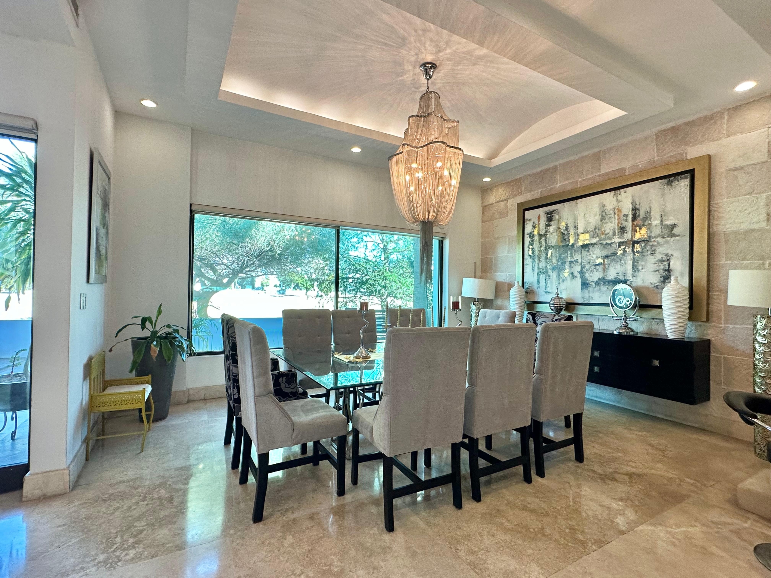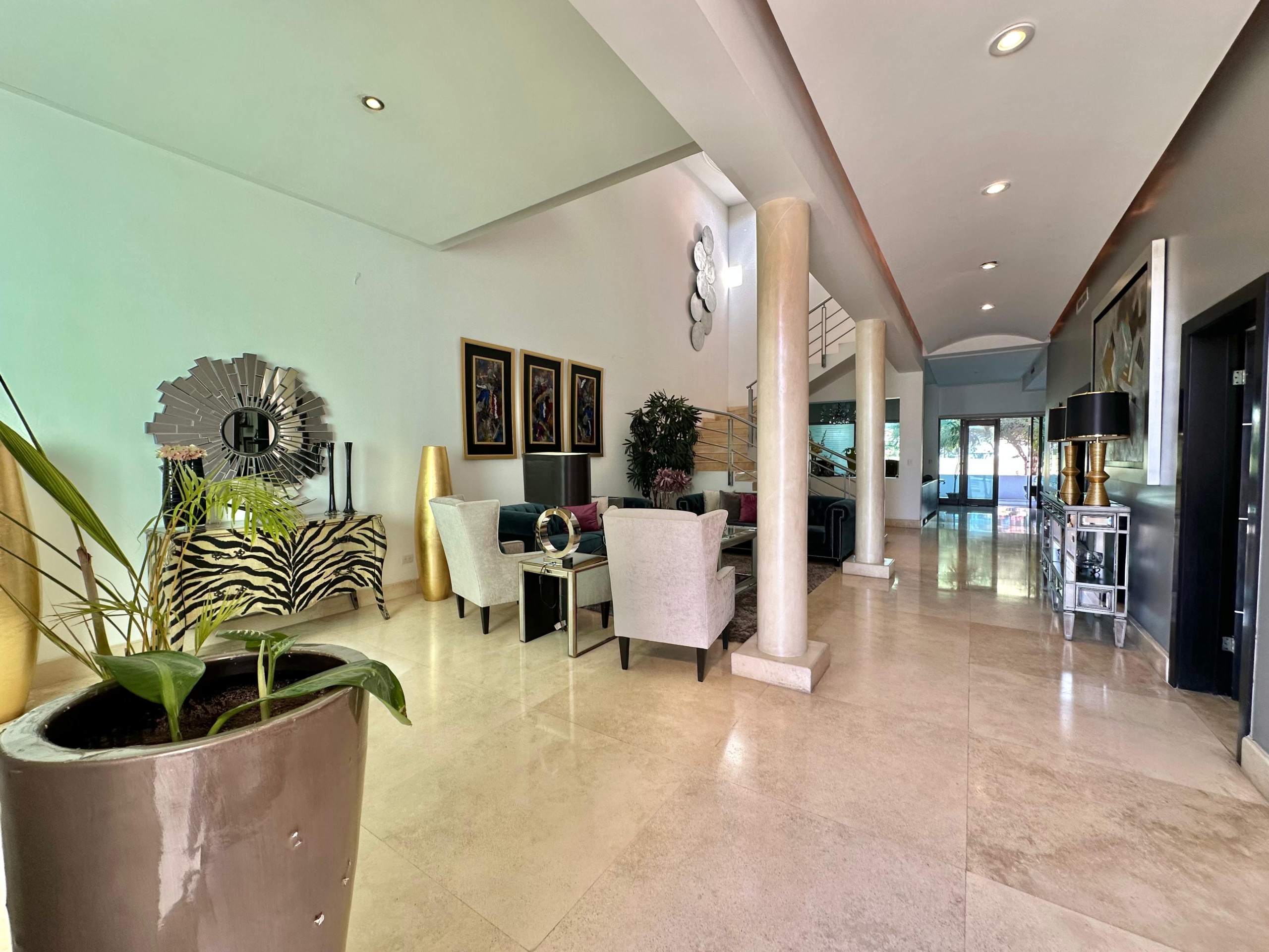 Cocina integral con estufa, campana, triturador, refrigerador, isla, granito, paneles solares, pisos laminados de madera rosa morada en todas las áreas, cristal templado en escaleras y balcón, 3 aires centrales (1 de 5t, 1 de 4t y 1 de 3t en rec ppal), espejos en baños, lámparas en cocina y sala, cortinas en todas las áreas, boiler, cisterna con hidroneumático h tanque estacionario de gas.